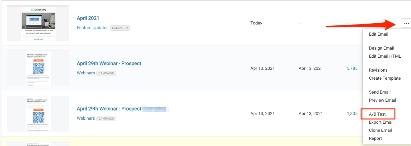 Before you create a new A/B test, be sure you've created the email you want to test. Next, find the email you want to create in either it's Campaign or in your list of all emails from the Emails Page. Click on the More Options menu (3 dots) next to the email you want to create the A/B test for and select A/B Test.
