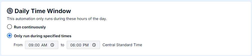 Automations can additionally be configured to run only during specific times of the day. For example, this is helpful to ensure SMS messages do not go out early in the am, or late in the pm. However, in most customer cases, it is recommended to run automations continuously.