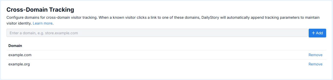 Cross-domain tracking enables DailyStory to maintain visitor identity when a known contact navigates between multiple domains that you own. When configured, DailyStory automatically appends tracking parameters to outbound links that point to your other domains, ensuring a seamless visitor experience across your web properties.