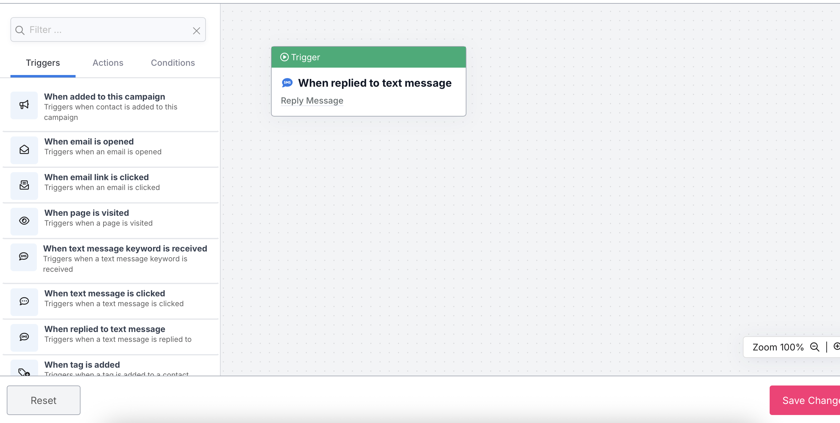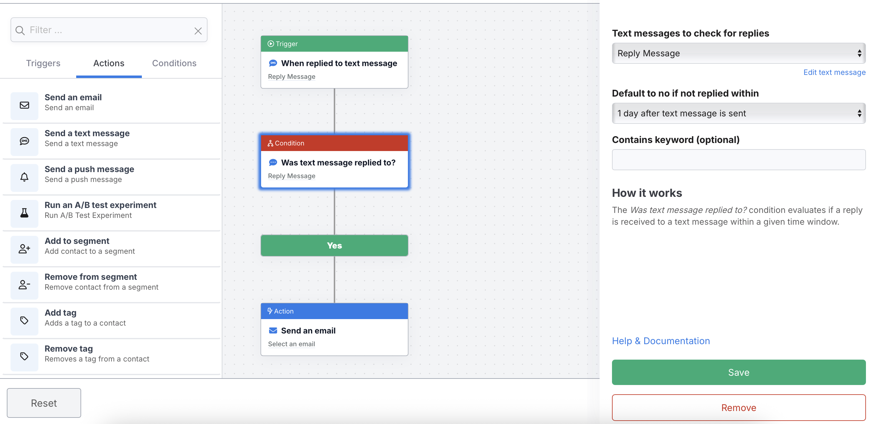 You can also setup a condition to evaluate the text message reply and take specific actions. For example, if you sent a text message with an an offer, e.g. "Reply YES to get this awesome deal" you could run a condition that would automate the series of actions when "YES" was received.