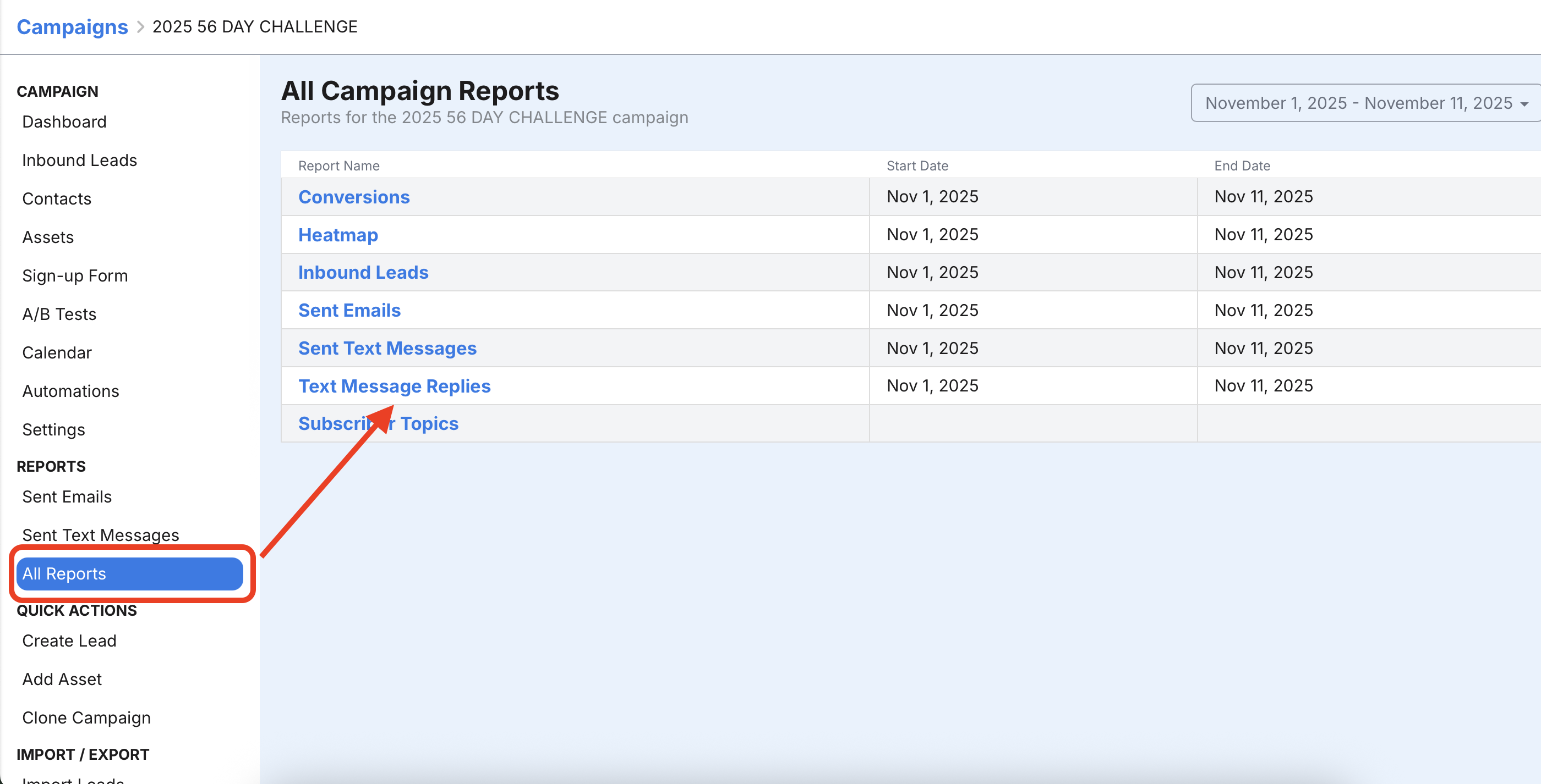 When viewing replies from within a campaign, click on the Reports tab on the left menu and then click on Text Message Reply Summary.