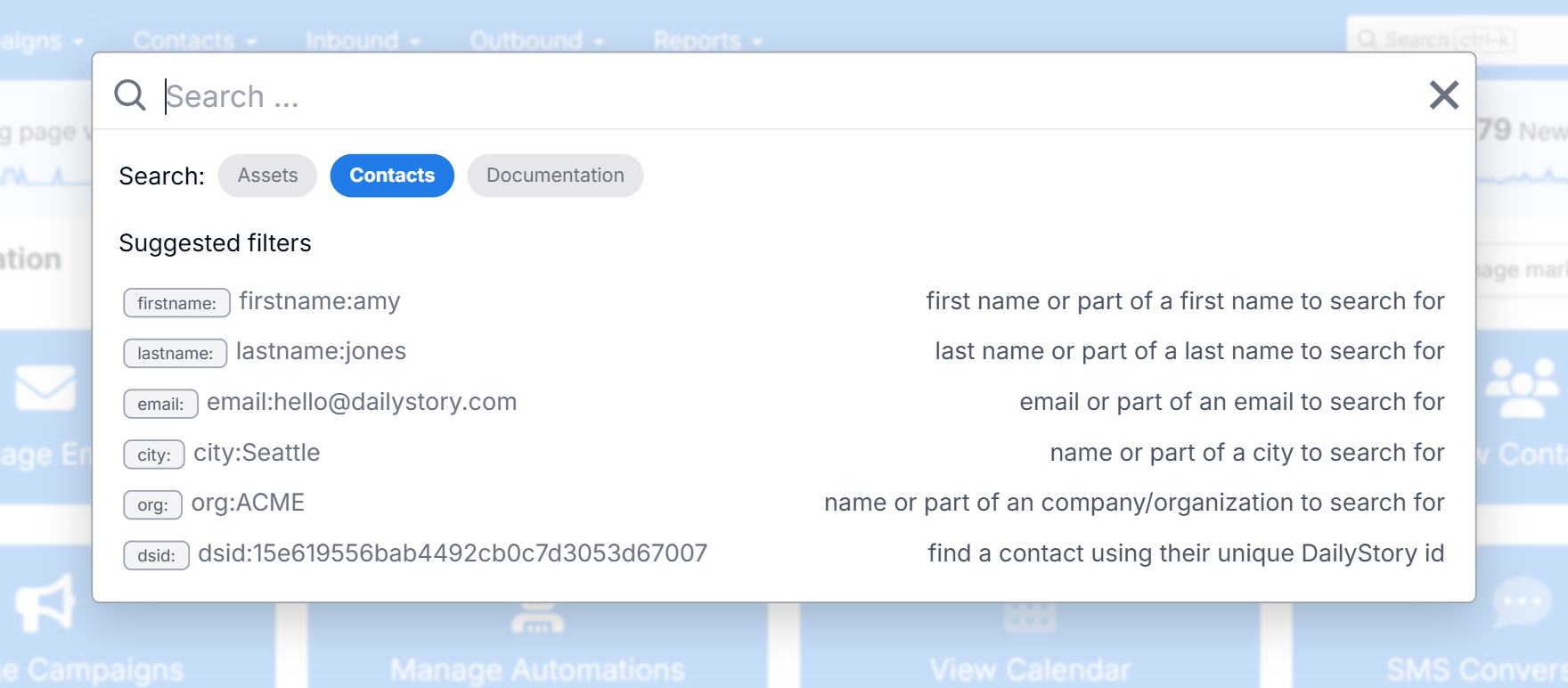 While using DailyStory it's normal to create multiple campaigns each with their own dedicated assets and automations. Global search provides a way to quickly navigate to any active asset without using the navigation. Just type the name, or part of the name, of what you are looking for.