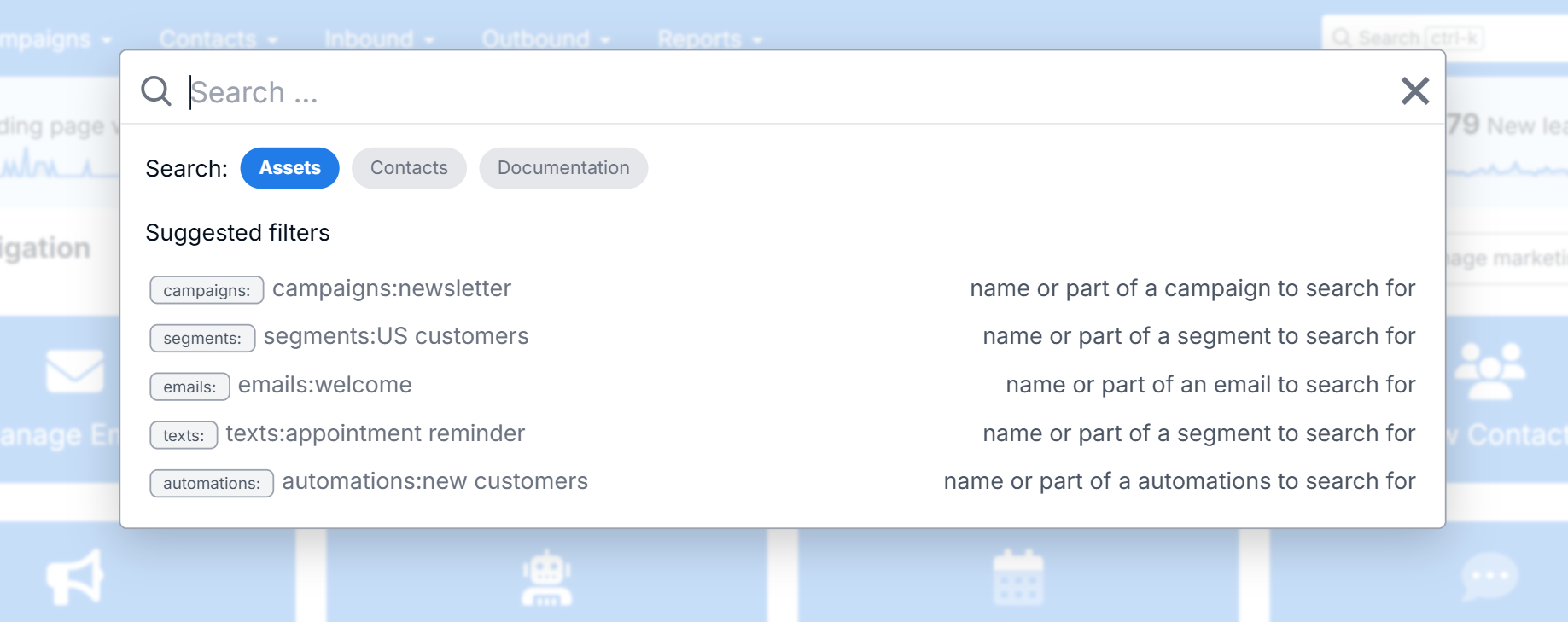 While searching you can type the text of what you want to search for or you can optionally use a filter to narrow your search to particular topics. For example, if searching for an email asset using the emails: filter will ensure that only assets that are emails are shown.