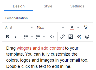 The Text / HTML widget is the most commonly used widget in the email designer. Use it for simple text or custom HTML.
