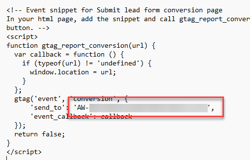 Next, copy the Event Snippet JavaScript and open in a text editor.