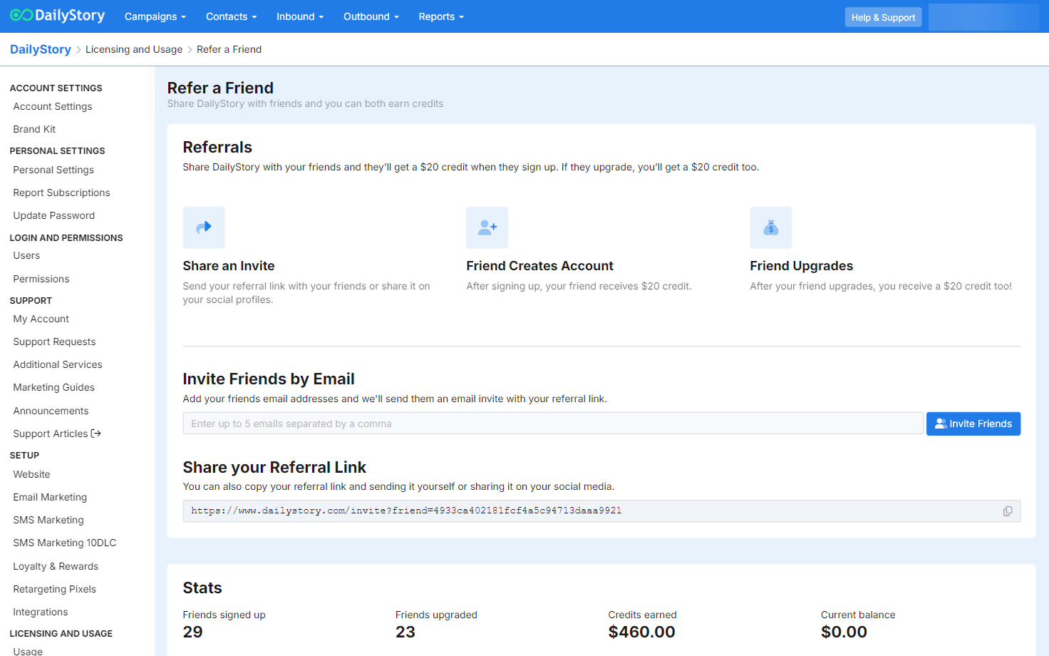 DailyStory uses a double-sided referral system. This means that the referrer receives a credit and the person who signs up receives a credit.