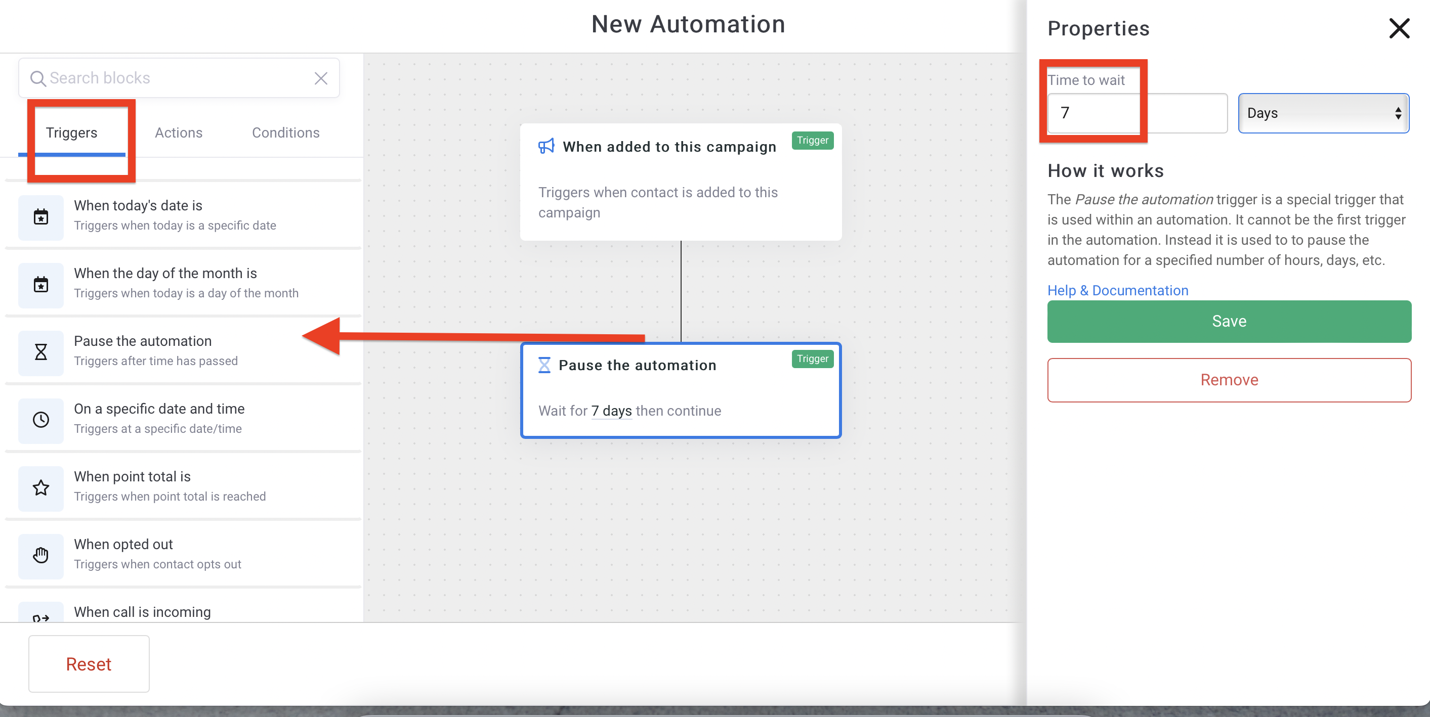 Pause the Automation. You can choose whatever time frame fits your need and preferences. For this example, we'll choose 7 days. This means we want to wait 7 days after they've made their last purchase before we go to the next step of sending them our message. Remember: they get added to the campaign from the segment we attached and they get added to the segment we designed based on their last purchase date of 1 day ago.