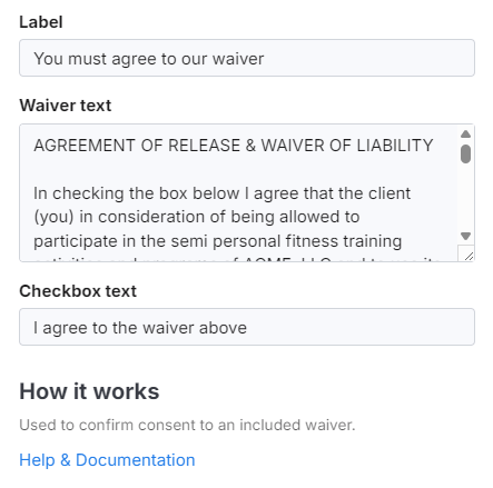 The waiver widget enables setting an optional label, the text of the waiver and the text of the consent checkbox: