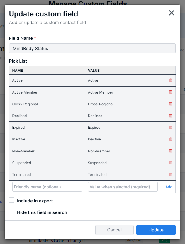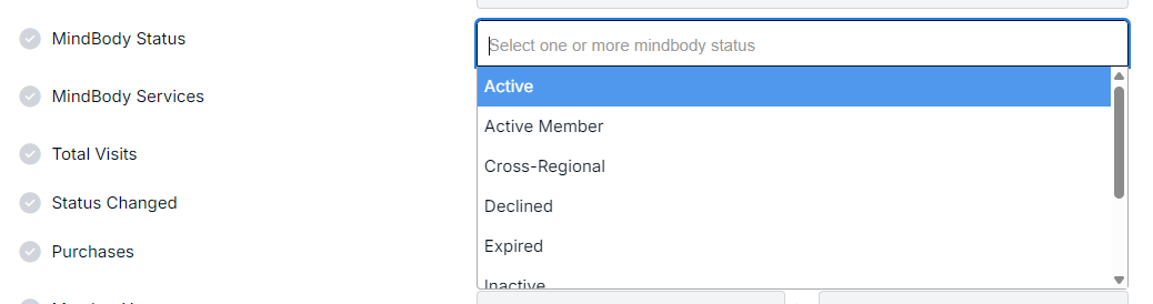 For example, when using the Mindbody custom fields such as Mindbody Status and Mindbody Services are created: