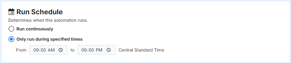 Automations can additionally be configured to run only during specific times of the day. For example, this is helpful to ensure SMS messages do not go out early in the am, or late in the pm. However, in most customer cases, it is recommended to run automations continuously.