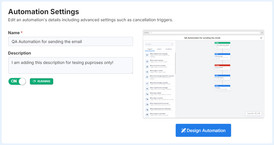 From the screen, you can easily change the name and description of the automation. And, toggle if the automation is running or not.