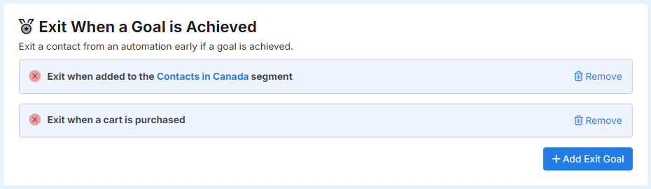 Exit when a goal is achieved enables you to specify goals, that when they reached, automatically exit the contact from the automation (vs completing the automation).
