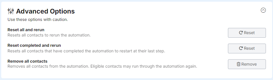 When contacts complete an automation, such as a drip campaign, this option allows you to reset the completed status. This is useful when you have modified an automation and want contacts to "restart" where they left off.