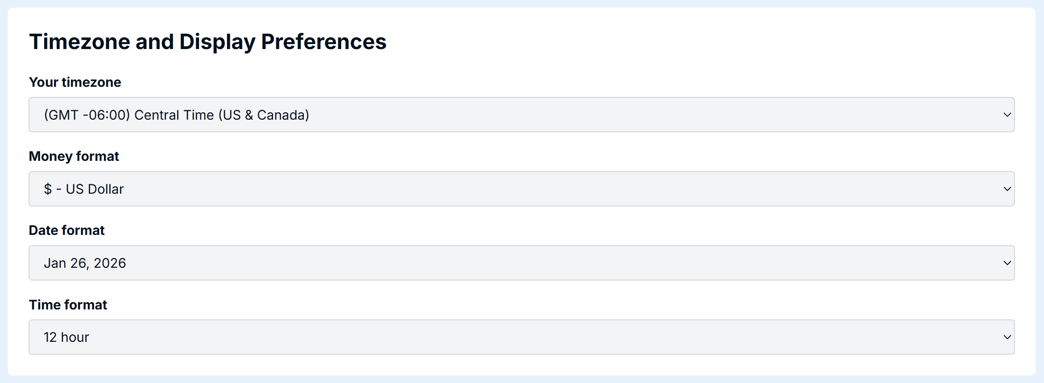Use Display Options to configure how DailyStory will display values, such as money, dates and times.